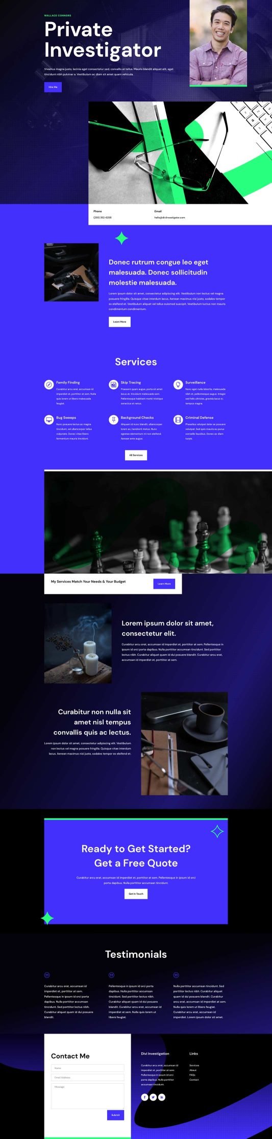If you’re looking to get a new private investigator website, you don’t want to miss out on the Private Investigator Layout Pack for Divi! Each page layout is built to impress your visitors with world-class web design. And it has everything you need to promote private investigator services, and much more. Use it to get your next private investigator website up and running today!
