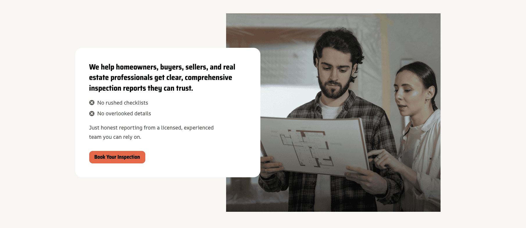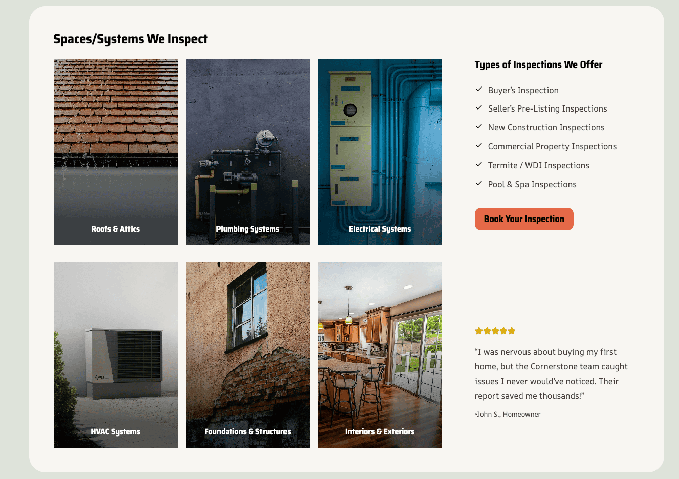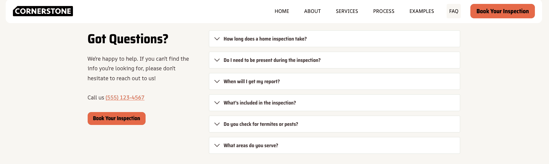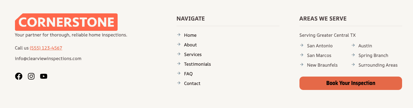 Cornerstone is a professionally designed one-page WordPress starter template built to convey trust, clarity, and attention to detail. Perfect for home inspection businesses, real estate stagers, or service professionals who want to communicate reliability from roof to foundation. With Cornerstone, you get clean design, purposeful layouts, and a no-nonsense presentation so that your prospects feel confident letting you under their roofs.